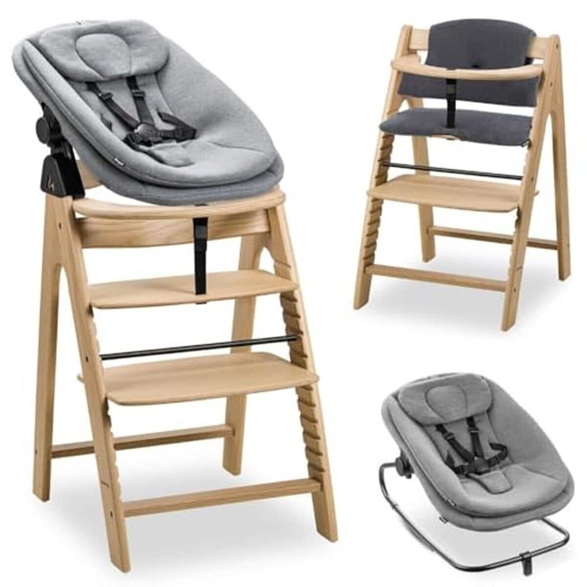 • Kinderkraft ENOCK Chaise Haute Bébé + Transat CALMEE, en Bois Naturel, Chaise d'alimentation, Évolutive, Réglable, Puericulture Bébé, Très Solide, Design Universe